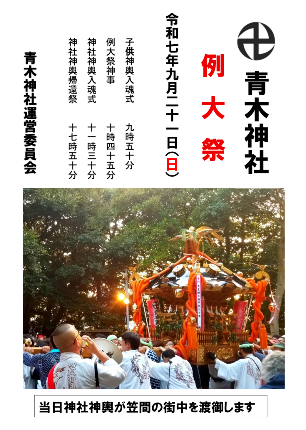 青木神社トップ › IMG_6695 2025-08-17 IMG_6695 関連記事 雪化粧の境内 「青竹の手水蓋」をご奉納いただきました 令和8年 どんど焼きを斎行いたしました 新年あけましておめでとうございます お餅つき 【令和7年 例大祭のお知らせ】